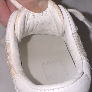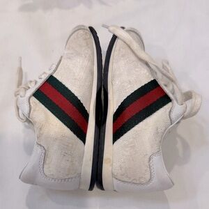 Authentic & Stylish kids' sneakers featuring a classic white design with bold red and green stripes. Perfect for everyday wear. It has scratches/rubs on leather but still has a lot of life left.