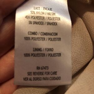 I took the size tag off but this is a size 16. It has a lining and a sash. The top layer is see through and the lining is beige. The back zipper does not go all the way up but the mesh back closes with a hook. It has cap sleeves