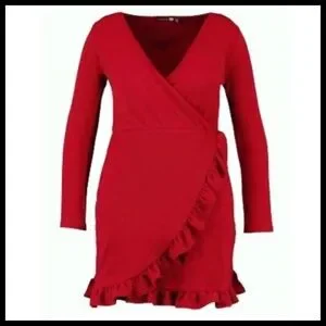 Every woman needs a little red dress in her wardrobe • NWOT/Never worn • V-neckline in a faux wrap design • Ruffle detail • Long sleeves • Regular fit / True to size • Thick durable fabric • 95% Polyester / 5% Elastane