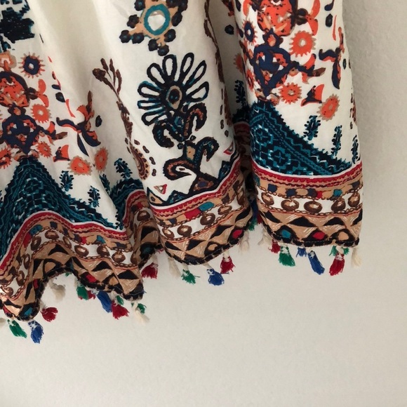 Chic floral romper featuring a V-neckline. Beautiful blue and orange patterns. Perfect for any occasion. Great details all over the romper including tassel embellishment along the bottom. Modesty snap along the neckline. Lined so not see through.