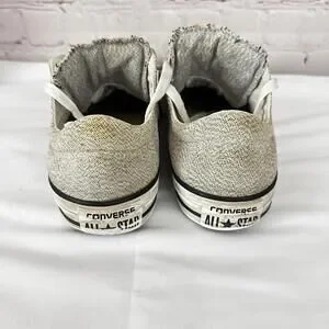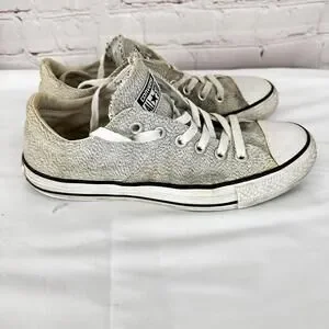 Step out in style with these Converse All Star sneakers, perfect for casual wear and versatile enough for any occasion. Featuring a chic light gray fabric upper with a classic low-top design, these shoes ensure comfort and trendiness. Key features include: - Size 8.5 for a snug fit - Durable canvas material for breathability - Iconic rubber toe cap and outsole for added style - Lace-up closure for adjustable fit - Lightly worn with character, ideal for an effortlessly casual look. Elevate your footwear game with this timeless design from Converse!
