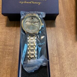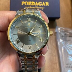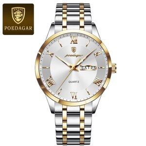 Elegant Poedagar watch with a silver and gold design. Features a quartz movement and day-date display.