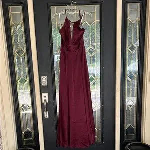 Step into elegance with this stunning burgundy evening gown. Perfect for any formal occasion, this dress features a sleek design that enhances your silhouette. Make a statement with its rich color and sophisticated style.