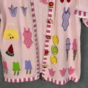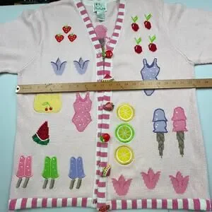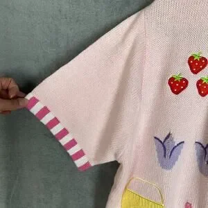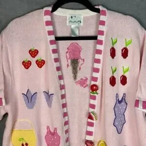 Quacker Factory Sweater Large Pink Fruit Cardigan Short Sleeve Summer Picnic