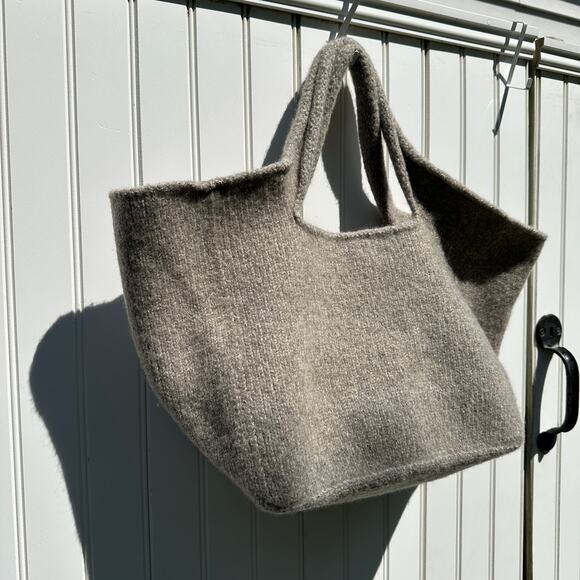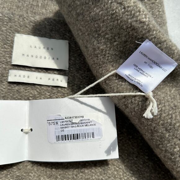 Lauren Manoogian's Market Tote is soft, textured, lightweight, comfortable, and chic. Tote all your necessities in a flexible, sculptural well-architected bag that drapes on your body comfortably and expands to accommodate it's contents. Pics show this ustuffed and unstuffed. This makes a great pillow / blanket when you are traveling on a long flight too! 100% Merino Wool.. "Rock Melange" is a greigey neutral hue best represented by hanging pics; pics of this lying flat came out darker. Brand new with tags. Made in Peru. Detailed measurements in the photo.