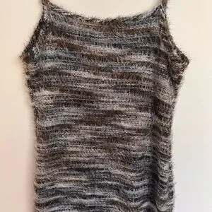 Stylish fuzzy knit dress shows off curves. Features a blend of black and gray tones. Perfect for layering
