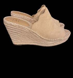 INC International Concepts Camile Suede Slip On Espadrille Heels, Size 8.5. These stylish high-heeled espadrille sandals feature a chic suede upper in a versatile tan/beige color, perfect for summer outings or a casual-chic look. The slip-on design ensures easy wear, while the espadrille heel adds a touch of bohemian elegance. Excellent pre-owned condition, with minimal signs of wear.