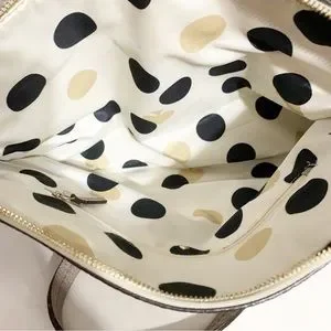 Kate Spade Grove Court Lainey satchel in taupe pebbled leather with matching trim and gold-tone hardware. Beautifully crafted with top handles and a fully lined black and tan custom-woven spade print interior. Organized with a main magnetic compartment featuring two slip pockets, plus two side zip compartments—one with an additional zip pocket. Magnetic closures, secure zippers, and a structured silhouette make this satchel both stylish and functional. Features the iconic Kate Spade New York gold-embossed leather plate on the front.