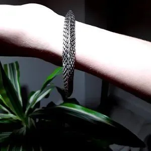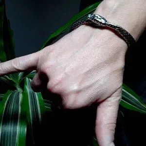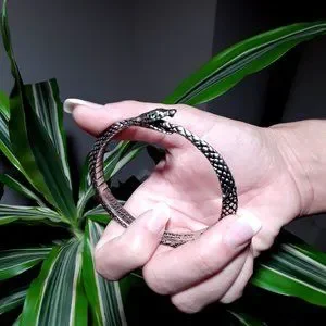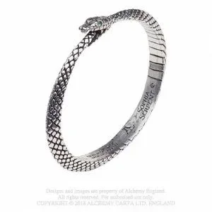 From ancient Greek philosophy, the Ouroboros, a snake-serpent eating its own tail, is the Gnostic symbol of eternity, rebirth and the unity of everything, representing both the sun and soul of the world. A detailed cast pewter, solid serpent bangle, (no adjustment), with small green Swarovski crystals.