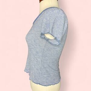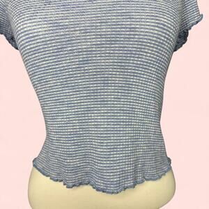 Adorable Abercrombie & Fitch ribbed baby tee in a soft blue and white micro-stripe pattern. Features a scoop neckline, cap sleeves, and feminine lettuce hem trim at the sleeves and bottom. Made from a soft and stretchy knit for that perfect body-hugging fit.