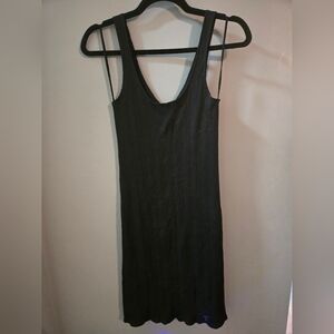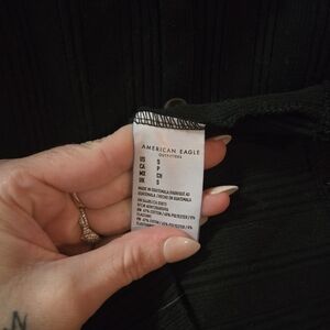 This chic black sheath dress from American Eagle Outfitters features a sophisticated V-neckline and a sleeveless design, perfect for a night out or cocktail event. Its form-fitting silhouette and midi length offer a timeless and versatile style that can be dressed up or down for any occasion.