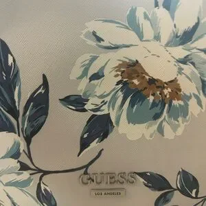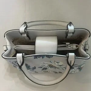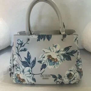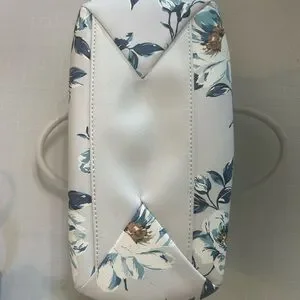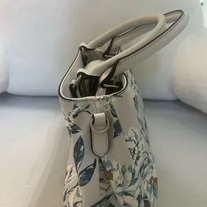 Elegant satchel with floral design. Features blue and cream hues. Ideal for any occasion.