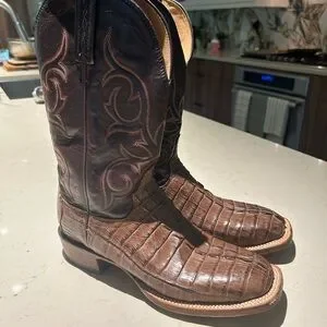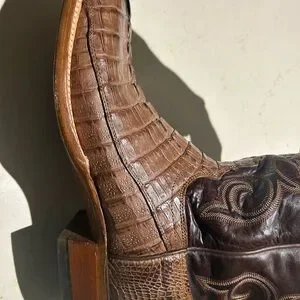 Elegant brown cowboy boots with crocodile texture. Intricate stitching on shaft. Perfect for style and comfort.