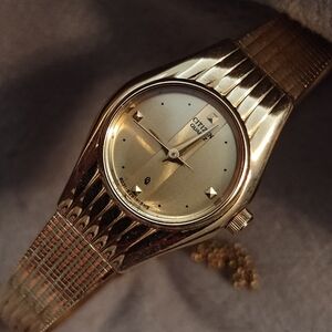 Vintage Citizen watch in gold. Japanese quartz movement. Sleek design. Classic round face measures 5/8". Case measures ~1" x 3/4". Fits a 7" wrist. Vintage clasp closure with safety chain for extra security. Running, keeps good time. See pics for exceptional condition.