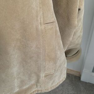This Jacket / Coat is in great pre-owned condition with just a couple of things to point out. If you are looking for perfection, please note: I looked it over very closely before listing and the only issues I found were: 1. At edges it is a bit darker, as any suede will do the more it is rubbed - edges of bottom ever so slight, same with cuffs and on some parts of the raised seam. 2. On the right arm there is a darker area that is more like a scuff. It seems like something that would come off at dry cleaner or even with just a suede brush. I will get a suede brush and try. 3. There is a tiny slit behind to topmost button it does not effect buttoning the coat, as the button is attached all the way through and not just to outer layer. I never buttoned the top button and the button hides this flaw, so it never bothered me, but want to point it out (see photos).