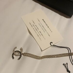 Stunning CHANEL necklace with gold and black accents. Features sparkling crystals for a luxurious touch.Must have for collectors. Brand new in larger box, pouch and camellia.
