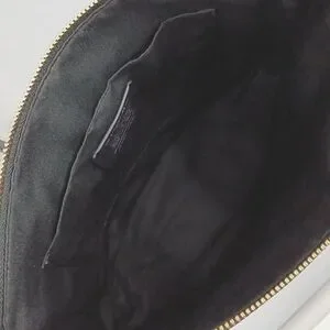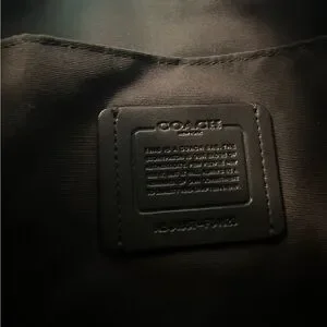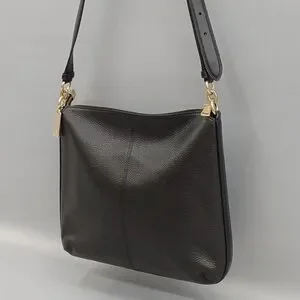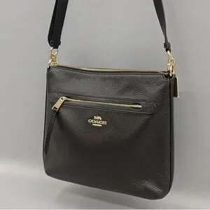 Sleek black leather crossbody by Coach. Features gold-tone zippers, logo, and hardware. Perfect for everyday elegance.