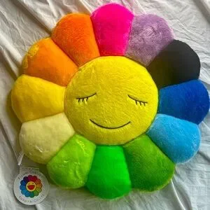 Bright and cheerful flower cushion with a smiling face. Features vibrant colors including yellow, orange, pink, purple, black, blue, and green.