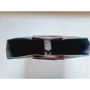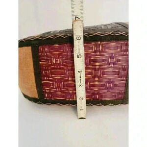 This vintage satchel bag is truly unique with its wood exterior and tribal pattern. The bag features a spacious rectangular shape with double handles made of wood, and a snap closure. The hardware color is black and the handle/strap color is brown, which adds a natural touch to the bag's design. Inside, the bag is lined with black polyester and cotton, and has inner pockets for organization. The bag is lightweight and perfect for travel, parties, or casual everyday use. Its colorful, bohemian, Hawaiian, and tropical theme adds to its charm. This bag is a must-have for any woman looking for a statement piece