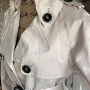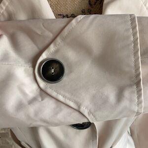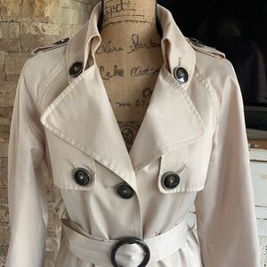 Great condition green with envy light tan/beige trench coat w belt. Cute button detail throughout. Silky material.