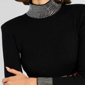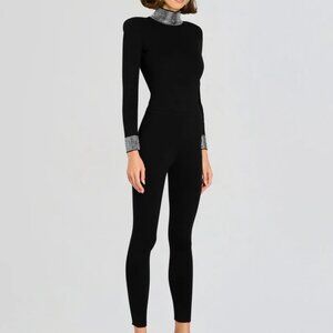Indulge in the sophistication and exclusivity of the Leanne Embellished Jumpsuit. Made from a luxurious knit material, this body hugging jumpsuit features a high neck and stunning embellished details. Elevate your style and make a statement with this fashion-forward piece.