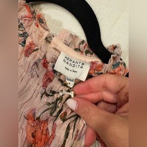 Chic dress with pink floral design. Features textured fabric and elegant details. Ideal for stylish outings.
