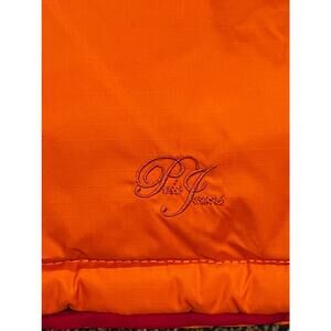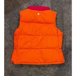 This is a vintage Ralph Lauren puffer vest with a unique ski theme. It features a quilted design in red reversed to orange nylon material, making it a rare find. The vest is adorned with 9 ski badges, adding to its charm and character. It is a size medium and designed for women who appreciate stylish and functional outerwear. No