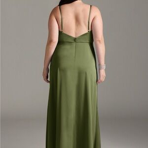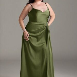 Chic olive green dress with elegant draping. Ideal for weddings and special events.
