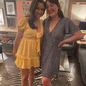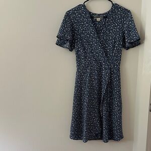 Elegant navy wrap dress with a delicate floral pattern. Perfect for casual outings or special occasions.