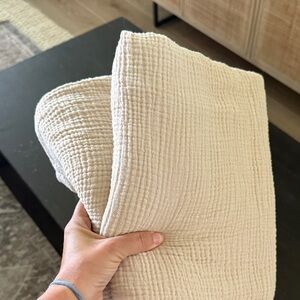 New condition. Size large 47x47inches. Soft material. Set of four textured fabric pieces in cream, blue, tan, and beige. Perfect for crafting or decor. Large muslin blankets lightweight and cozy. Price is for all 4