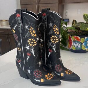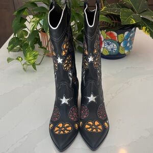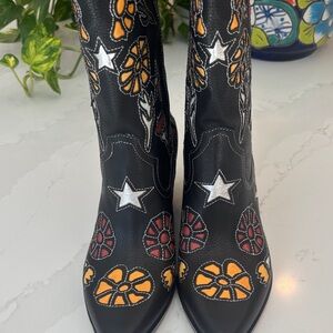 Chic Western black boots with colorful floral designs. Perfect for a bold fashion statement at your next music festival or concert. Western boot fashioned with a pointed toe and angled block heel. NEW IN BOX, NWT #DolceVita #WesternBoot #MusicFestival #Cowgirl