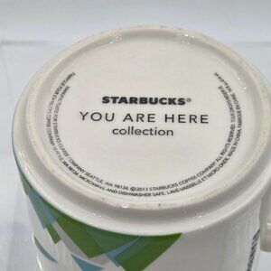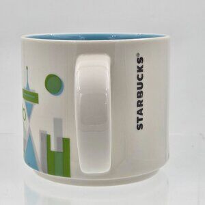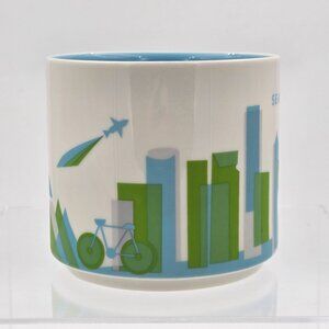 Capture a piece of the Emerald City with this Starbucks You Are Here Collection Seattle coffee mug. Released in 2013, the 14 oz ceramic cup features a white exterior with crisp blue and green geometric skyline graphics and a sky blue interior. The sturdy D-handle makes it comfortable for daily use or display in a city mug collection.