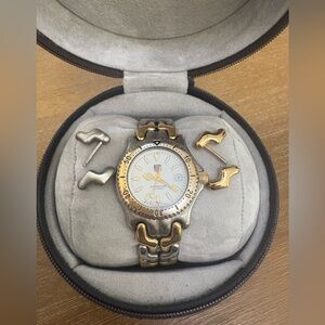 Stylish Tag Heuer watch. Features a gold and silver bracelet. Ideal for any event. Comes with the original box and extra links to extend the length. The watch has a brand new battery and works perfectly.