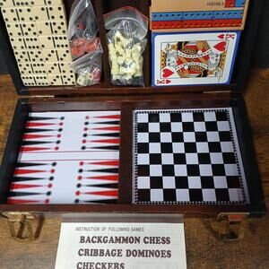 Cards and dominoes are sealed. All pieces complete. Case has wear.