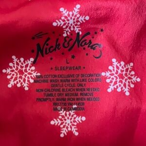 This adorable and cozy flannel pajama set by Nick & Nora is perfect for chilly temperatures and features two pockets in the top and a button front closure. Bottoms are pull on style with a tie at the elasticized waist and three functional buttons at the fly. The winter themed print shows various puppies engaging in winter activities. Top is 28” long from center back and pit to pit is 23”. Pants have an elastic waist of 32” and an inseam of 30”. They are in good gently used condition. I wore them only a few times.