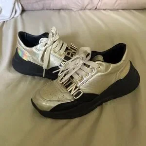 Shine with these metallic gold Valentino sneakers. Sleek design with bold branding. Ideal for fashion-forward looks.