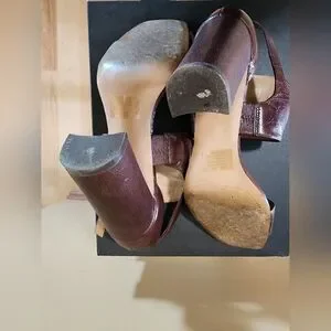 These versatile heels feature a comfortable block heel and a stylish ankle strap design in a rich auburn/brown color (AUBRGN on box). They're the perfect blend of elegance and comfort for all-day wear.