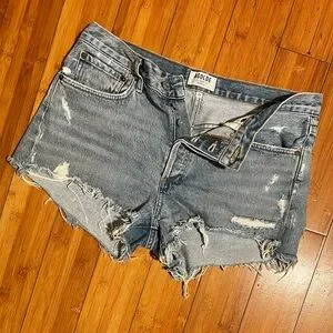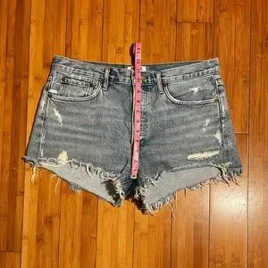 Agolde Parker Vintage Cut Off Distressed Jean Shorts Size 29. Relaxed fit, high-rise features button front closure, five pocket styling, intentional distressing throughout. Made from premium 100% cotton. Gentle use, great preowned condition, see photos for details and approximate measurements.