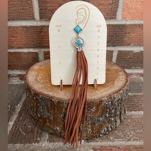 • Long brown faux leather fringe with saguaro cactus and circle pendant details.