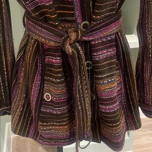 Stylish tweed striped fully lined jacket with belt. Features button closure & front pockets with snapped closure.Perfect for layering. Excellent condition no holes or stains.
