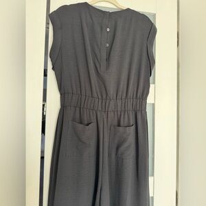 Chic and versatile black jumpsuit. Features a sleeveless design with back pockets. Ideal for any occasion.