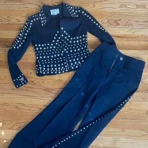Elevate your style with this chic studded black pants and jacket set. Perfect for a bold, fashionable look. Vintage from the 1970’s. Size 5/7, but more like a size 0-2. My mom was 5’2 and 100-110 lbs.