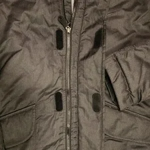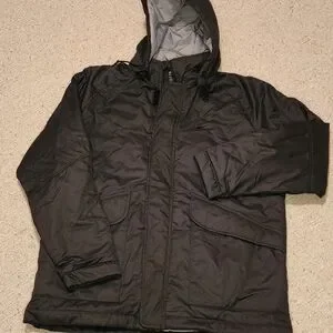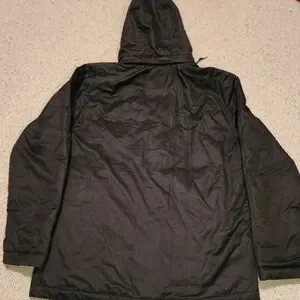 Sleek black puffer with detachable hood. Storm Fit. Ideal for cold weather. 27" chest, 33" length, 34" neck to end of sleeve. 100% Polyester. New w/o tag.