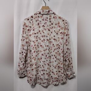 Elevate your wardrobe with this elegant floral button-up blouse. Perfect for any occasion, this top features a beautiful blend of cream and pink hues. Pair it with your favorite jeans or skirt for a chic look.