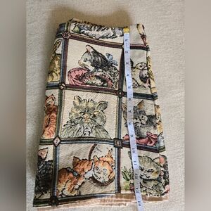 Charming, coquette & cute mini skirt. Features a tapestry-style design & a unique cat print. Perfect for casual outings or a night out. Double lined & has a zipper enclosure for comfortable wear. Can easily be layered and is a perfect addition to an autumn to fall wardrobe!