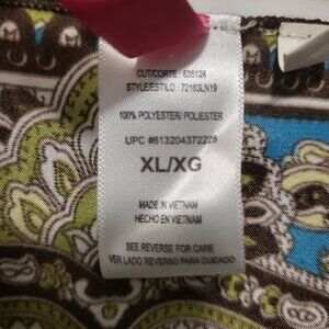Excellent previously owned condition, no flaws. Size XL, brown, aqua blue and a splash of green, satin (100% Polyester) blouse. Unsure of manufacturer because the print rubbed off the tag. Smoke-free, pet-free home.