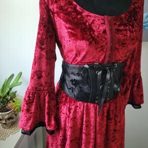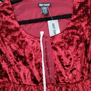 Brand new with tags Hot Topic red velvet dress, size Small. Romantic, witchy, and Ren Faire-inspired — this piece features dramatic details like: