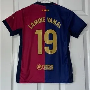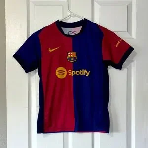 Nike Barcelona jersey for kids. Bold red and blue design. Features team crest and sponsor logo. Says size 24