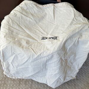 Used only a few times- Men's blue canvas Jack Spade Dipped tote with tonal stitching, coated canvas contrast, tan leather handles at top, canvas interior lining, four pockets at interior walls; one featuring silver-tone zip closure, logo patch at front and concealed zip closure at top. Includes shoulder strap and dust bag.