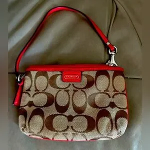 Chic Coach wristlet with iconic brown pattern. Bold red trim adds flair. Perfect for essentials.